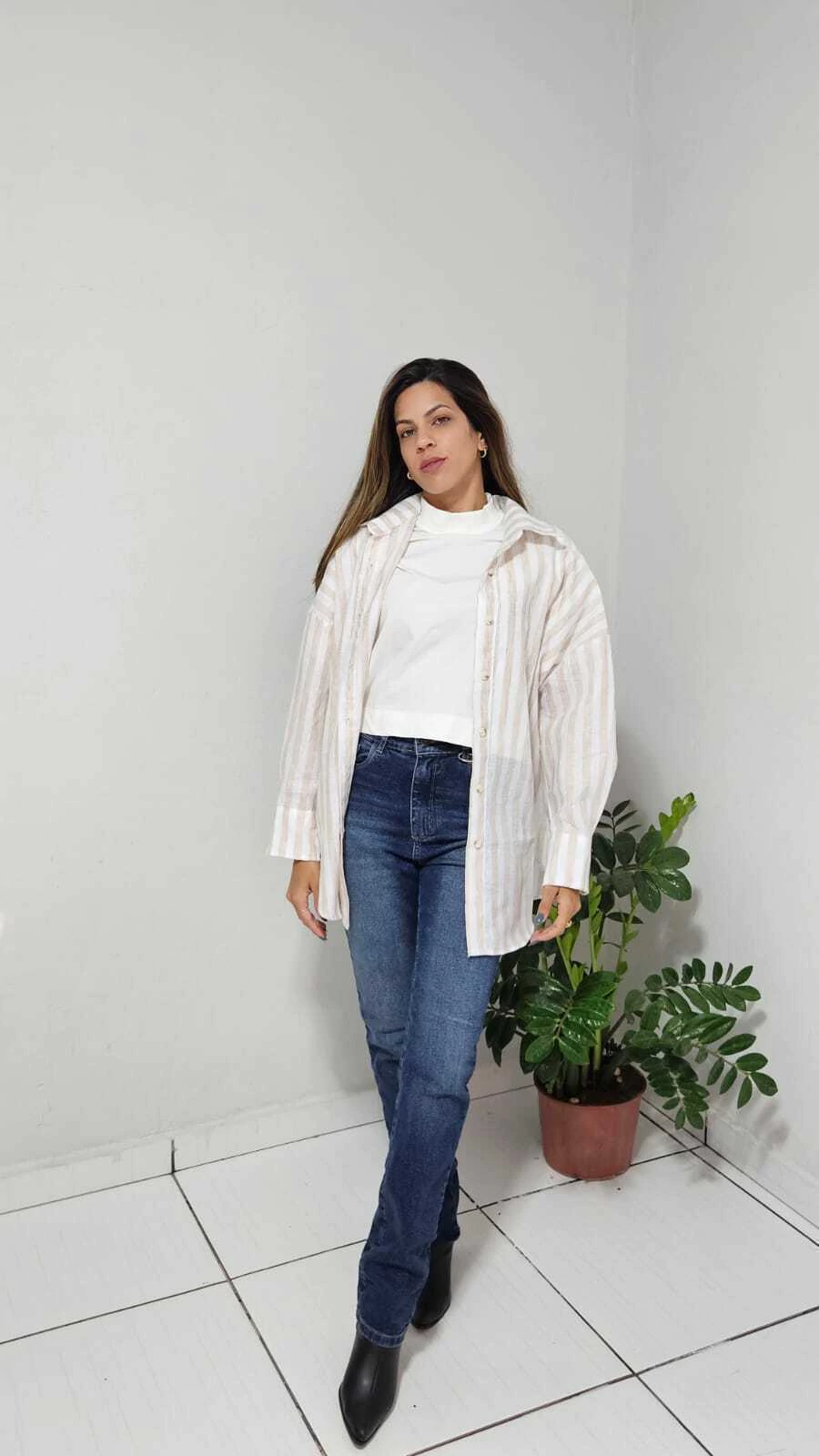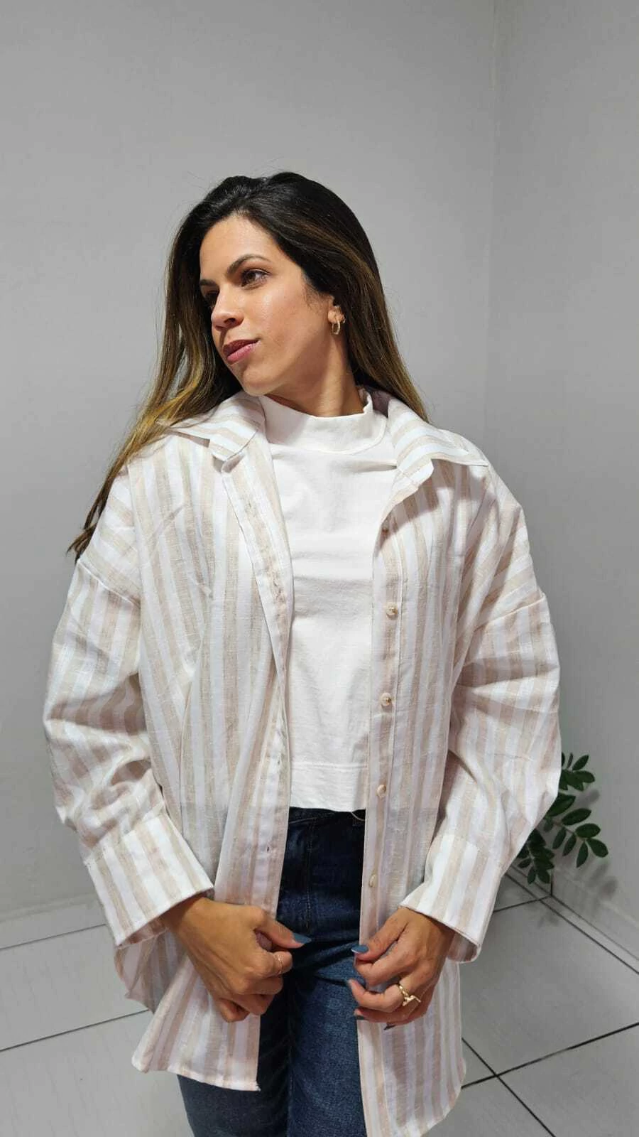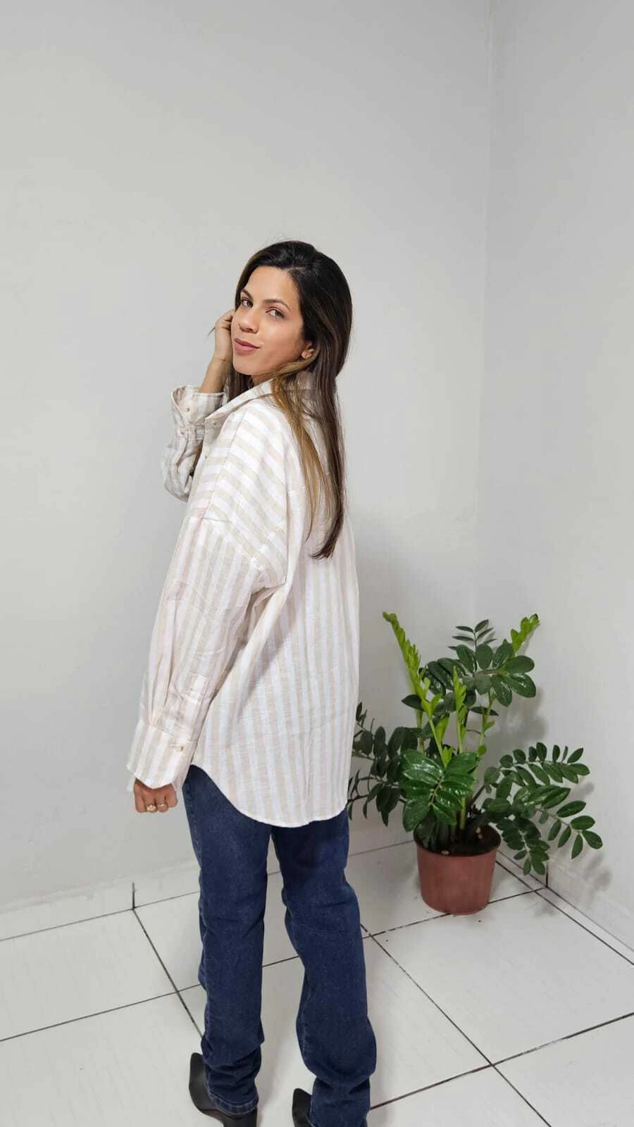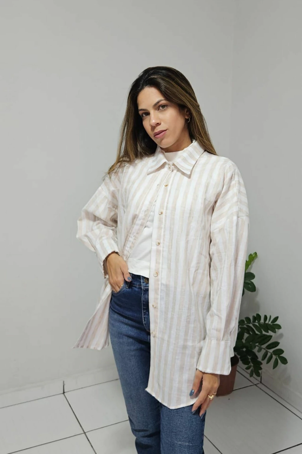 confeccionada em 100% algodão, essa camisa apresenta tecido estruturado que garante caimento impecável e durabilidade. O design conta com modelagem levemente oversized, proporcionando conforto e um toque despojado ao visual. Possui estampa listrada vertical em bege e branco, gola clássica, fechamento frontal por botões e mangas longas com punhos ajustáveis. Ideal para composições casuais ou sobreposições estilosas.