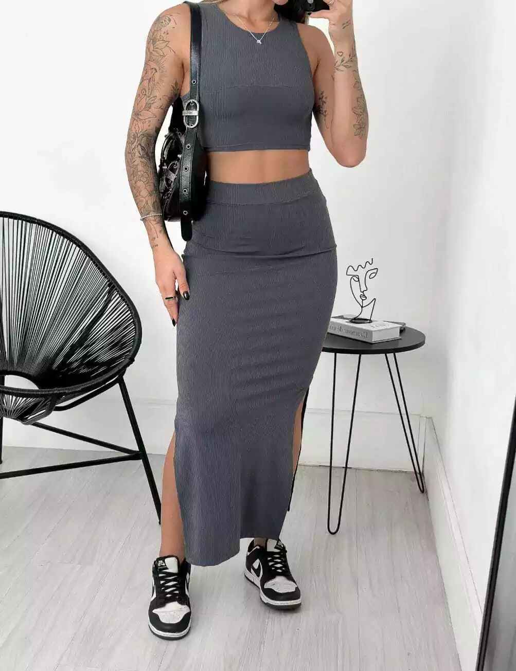 Conjunto de top e saia na cor cinza chumbo. Sendo o top sem bojo, porem não marca. A saia possui fendas laterais.