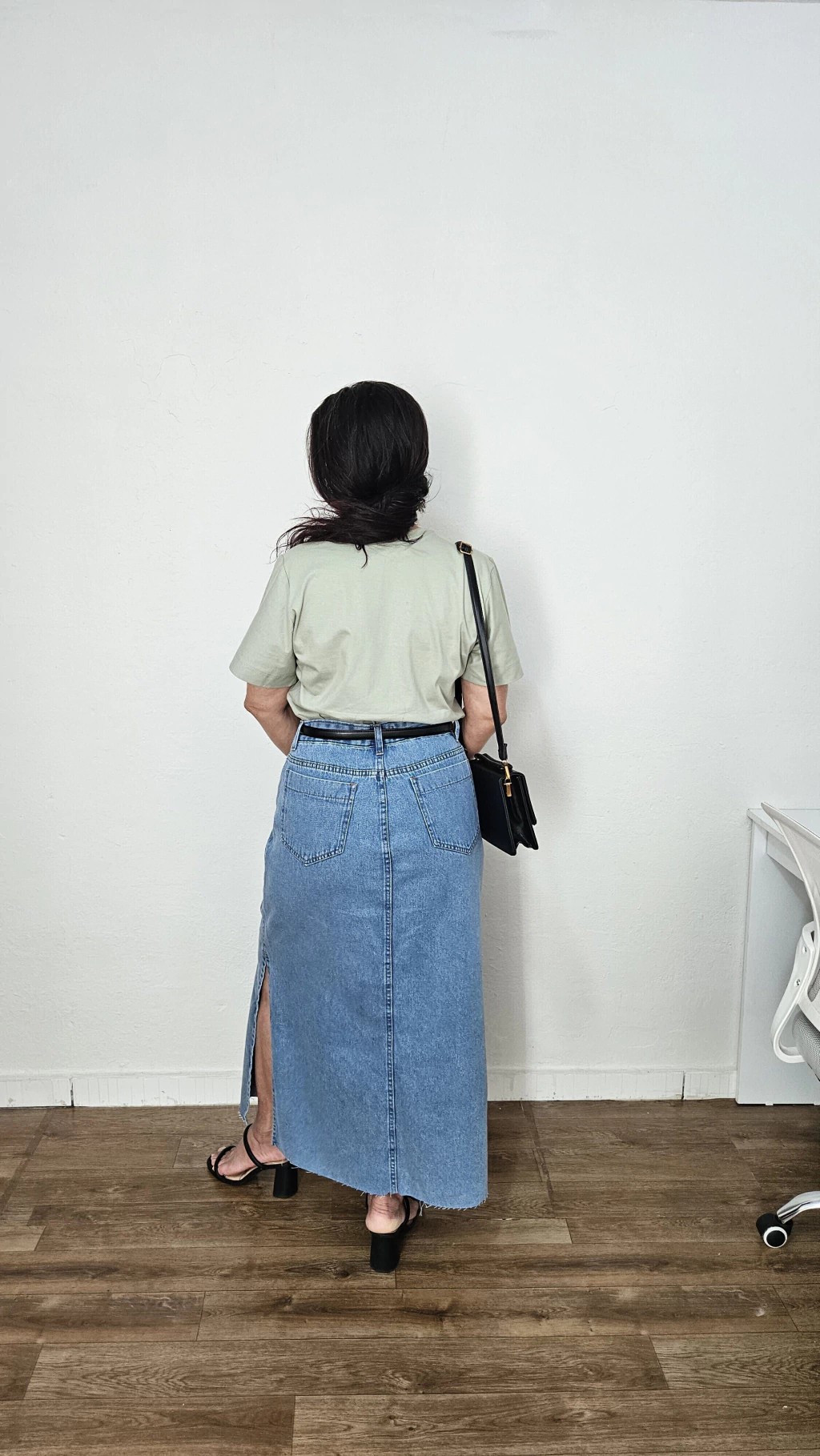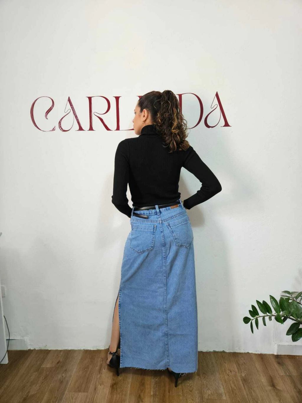 A saia jeans midi com abertura lateral traz modernidade e praticidade para o guarda-roupa feminino. Com comprimento midi, cós alto e fenda lateral que garante mobilidade e um toque fashion, é perfeita para compor desde looks casuais com tênis até produções elegantes com salto. A lavagem jeans clássica torna a peça atemporal e indispensável.
