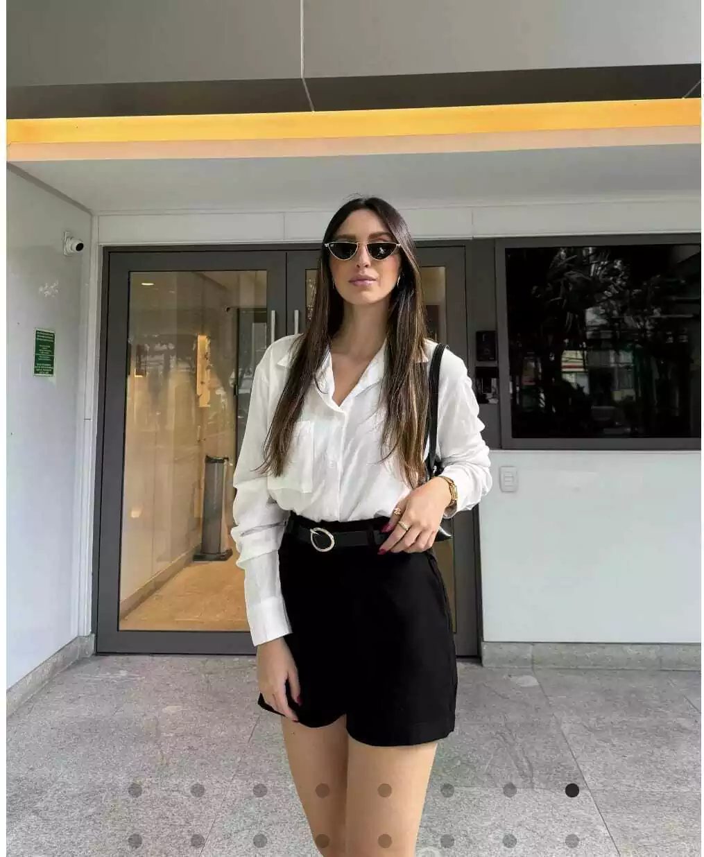 O short feminino alfaiataria preto é confeccionado em tecido twill e apresenta um design refinado com pences na frente e na parte traseira. Equipado com zíper e botão para um ajuste personalizado, conta também com passantes e bolsos laterais, oferecendo funcionalidade e um toque moderno ao visual. Ideal para quem busca praticidade e estilo.