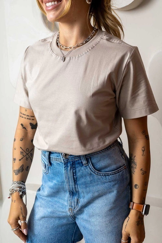 tshirt com modelagem tradicional de camiseta gola''O'' com gola em ribana canelada e costura ombro a ombro.