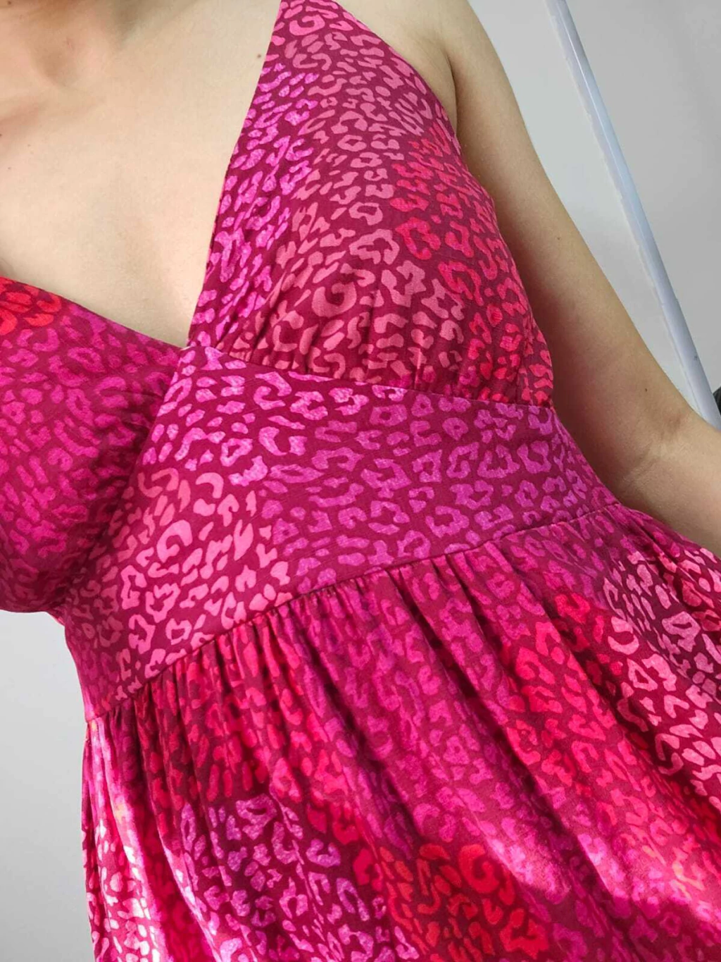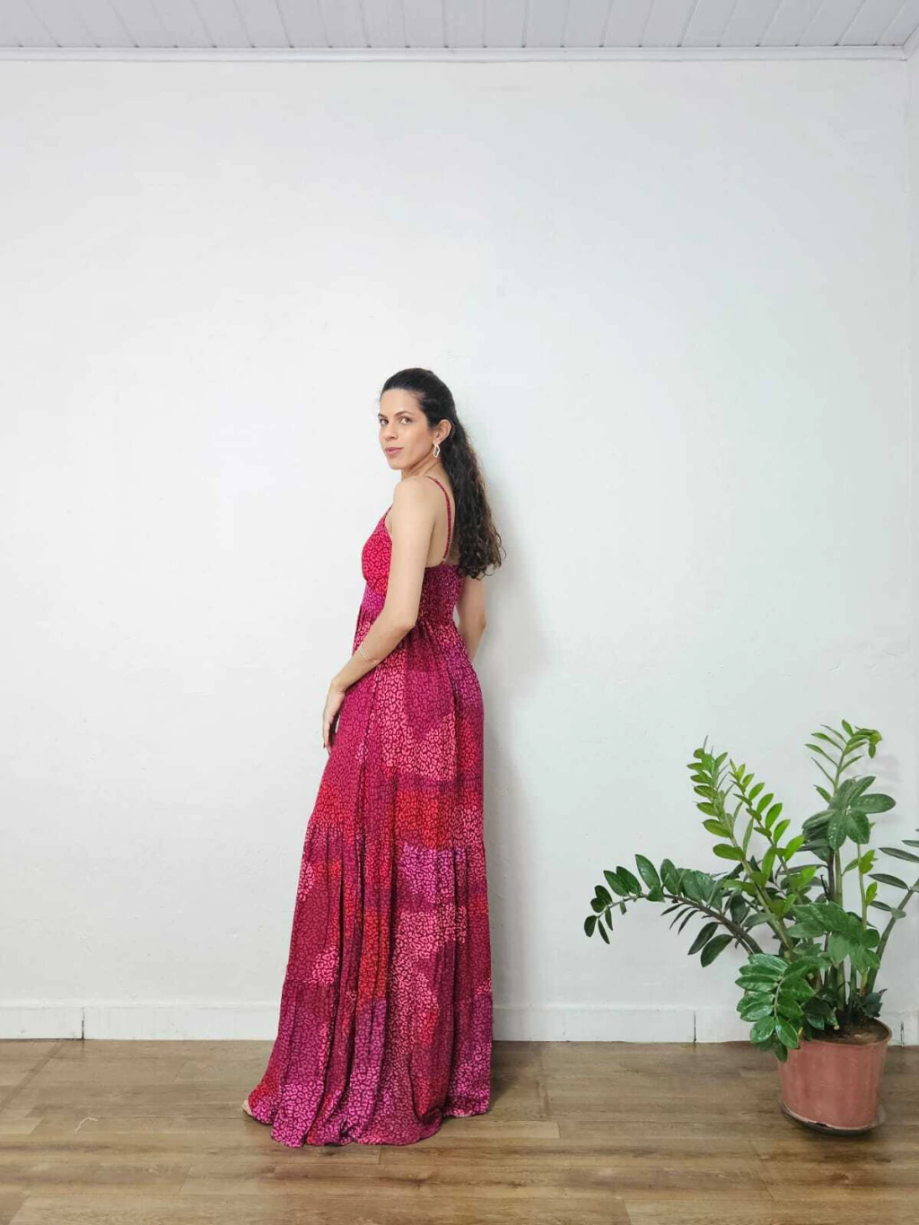 O vestido longo animal print é a escolha perfeita para quem busca um visual sofisticado e cheio de personalidade. confeccionado em tecido leve e fluido, ele possui modelagem acinturada, decote em v e alças finas, que valorizam a silhueta com delicadeza. A estampa animal print em tons de laranja, vermelho e preto traz um ar marcante e atemporal, ideal para produções que vão do casual chic ao elegante.